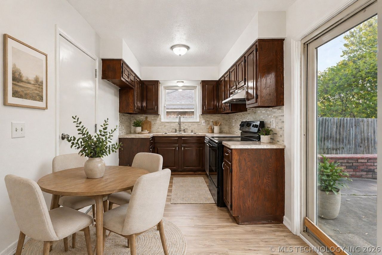 Updated home in the Union School District with convenient access to Highway 169 and the Broken Arrow Expressway. Located near CAP Tulsa Briarglen Early Childhood Education Center, McCullough Park, and shopping and dining at Woodland Hills Mall. This 3 bedroom, 1 bath home includes interior updates completed in 2025-2026 including counters, sink, fixtures, doors, hardware, trim, paint, and flooring. Additional improvements include newer vinyl windows and updated appliances. Exterior features include privacy fencing, covered front entry, and full brick with vinyl siding accents. Garage includes expanded laundry space. Information believed accurate. Buyer to verify schools, measurements, and features.